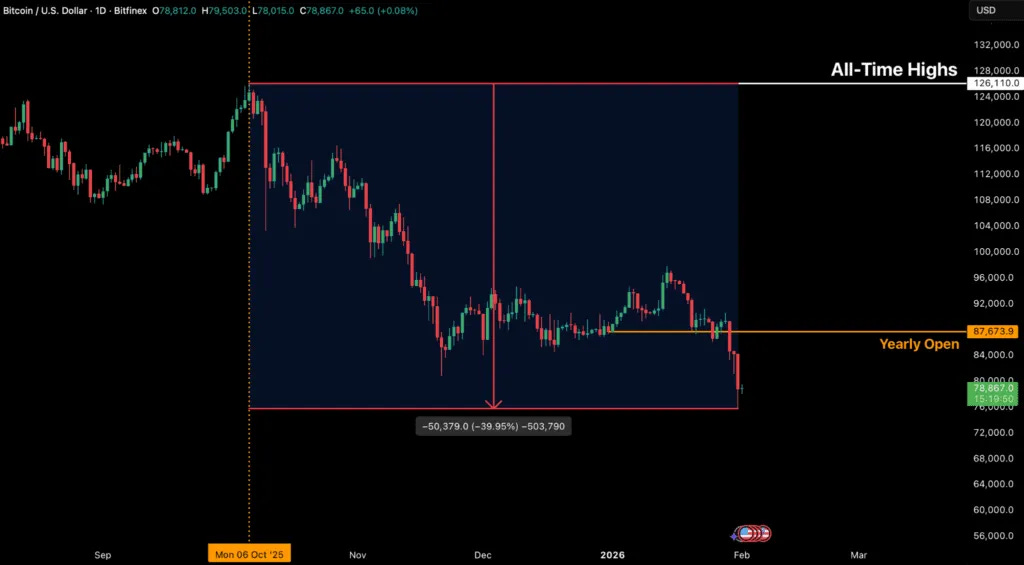 本周加密市场经历了剧烈的结构性重置。受美联储新任主席 Kevin Warsh 确认提名的鹰派预期影响,叠加地缘政治不确定性,市场风险偏好急剧下降。BTC 跌破 $80,000 关键心理关口,目前在 $73,000 - $74,500 区间寻找支撑,创下连续第四个月的下跌记录。